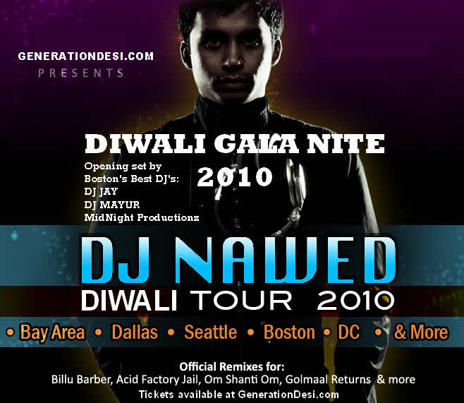 On Nov 6th, on the occasion of Diwali!  We are also celebrating the Badshah of Shahrukh Khan's Birthday with his Favorite DJ.  Celebrity DJ Nawed is coming all the way from Mumbai to rock Boston for One Night Only as part of his Diwali 2010 U.S.A tour!  Deejay \ Producer, Nawed has done the official remixes for such films as: Jail, Don, Golmaal Returns, Om Shanti Om, Bluff master, Salaam Namaste, Billu Barber & more!  We are also celebrating Shaharukh Khans Birthday as well!  This is Shahrukh Khan's favorite DJ people!!  Over 300+ people expected!  One of our Biggest Desi Party of the years!!