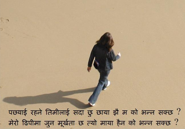 Suren, Thank you for starting a refreshing thread. Bhoopi inspires all. He wrote what he really wanted to write. Many others wrote what they thought they ought or can write. ----------------------------------------- Hancyguy, Thank you for your kind words. The picture that breathed the real life that the words of the poem hardly managed to depict is true hakdaar of the compliment. ---------------------------------------------- Newuser ji, Isn't the muktak "गधालाई पनि हजुर भन्न मन लाग्छ" from Haribhakta Katuwal instead ? And, "जब रात पर्छ" sounds like one from yourself. Beautiful one. ----------------------------------------------- Sitara, :-) --------------------------------------------- Now to continue with the thread, here is a tiny poem- just a single shlok.