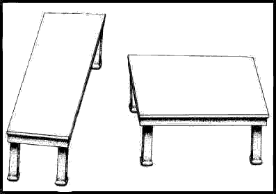 Check out the two tables above. The one on the right is much more of a square, and the one on the left is much longer and skinnier, right? Wrong! The surface area of each table is actually identical! To prove it, put a peice of typing paper up the screen and VERY LIGHTLY trace over one of outlines of the table top. You'll see that the outline matches perfectly!
