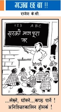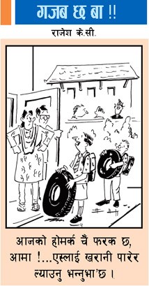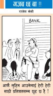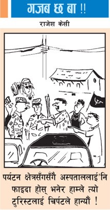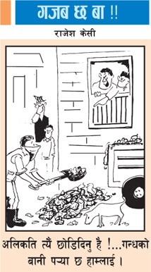 I enjoy his cartoons a lot. Please check a collection of his cartoons "Rajesh KC Ko Cartoon Shangraha : Part-1" (2004). Very nice one.