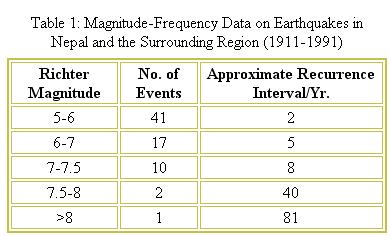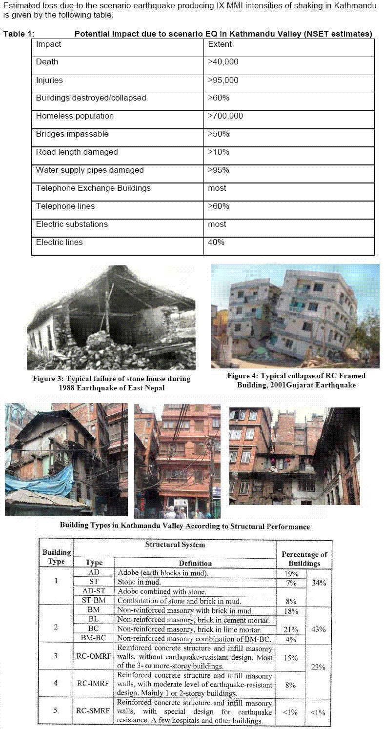 So, what is an earthquake? Just the shaking of the ground and destruction or is there more? Well, most people who are unaware of what earthquakes are tend to define an earthquake as a disastrous event that causes nothing but destruction. This is true to some extent but if it were not for earthquakes, the map of Nepal would be very different today. The Himalayan range that we are proud of today is a formation made from earthquakes. They are formed resulting from intracontinental collision of the Indian Plate with the Eurasian Plate. The Indian Subcontinent drifts northward beneath the Eurasian Plate at a rate of 2 cm per year that creates every 200 years or so a series of great earthquakes. Significant property damage and/or loss of life following an earthquake are an ever-present threat and apply to all natural disasters. The recent historical example is 1934 Bihar-Nepal earthquake that reached 8.4 on the Richter scale with an intensity of X. Over 8000 people died, 15,000 were injured and 200,000 houses destroyed. A large earthquake of magnitude 8 or more has not occurred in Nepal for last 69 years. It will occur but, When? Where? Another vital question is "are we well prepared for the impending earthquake?" Kathmandu’s population and building construction has increased more than 10 times compared to time of the 1934 earthquake. The increased density of population and buildings in the city means that more people are at risk from earthquakes as compared to that of 69 years ago. If a major earthquake should strike now, the deaths and damages are feared to go up more than 10 folds. It is estimated that depending upon the time of the earthquake some 40,000 people could perish. The country has become much more vulnerable to seismic disaster than ever before due to rapid population expansion and uncontrolled urbanisation. This trend is intensifying rapidly everyday. The scale of potential human suffering will be much greater in terms of deaths, injuries, incidence of shock and bereavement incorporated with subsequent disease and long-term illness. http://www.nepalnews.com.np/contents/englishweekly/sundaypost/2003/feb/feb16/2ndpage.htm When an earthquake of the magnitude that just occurred in Pakistan hits Kathmandu and the hills of Nepal…. Tens of thousands will die immediately and be injured as poorly constructed brick buildings collapse. There will be no effective system for bringing in relief. The two roads to the plains of India will almost certainly be blocked; The airport, which is built on lakebed sediments, could well be unusable; Roads, bridges and other infrastructure that links communities within Kathmandu will be damaged and blocked; Rural areas are likely to be completely inaccessible; Water supply and sanitation systems – two of the most important needs for survival – will collapse. Disease will spread rapidly due to disruption of water supply and sanitation systems. Within days the immediate impacts of the quake will be compounded by disease as sanitation collapses and hundreds of thousands of people are forced to depend on whatever water they can find. An earthquake of magnitude 8 or greater is all but inevitable in the Kathmandu region. The only question is when? http://www.i-s-e-t.org/nepaleq.html