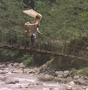 अनि बाटो अप्ठेरो केरे, अब वालिङ सम्मन त हो नि बोकेर लानि, त्याँसी उता त मटरमा चडेसि मटरले जो पु-याम्छ केरे । तर तो तलको खोलाको झोलुङ्गे पुल भनि डरलाग्दो छ है, अब बिरामी मुन्छेलाई डोकामा बोकेर लान त बलियै मुन्छे चाईन्च के । अनि नेपे दाजीले पालो खटाए । तो मुन्छेलाई चईनी मुन्द्रे र बेँसिथानेले घुचेटेको भएर तिनारुले अस्ताल सम्मन जो लानि, तलको तो खोलाको झोलुङ्गे पुल चईनी अरु भन्दा बलियो-बाङ्गो लाले जो भओ केरे, लालेले पुल तारिदिनी भनेर नेपे दाजीले उर्दी लाए । फुटाँ लालेले पुल तार्दै छन केरे ।