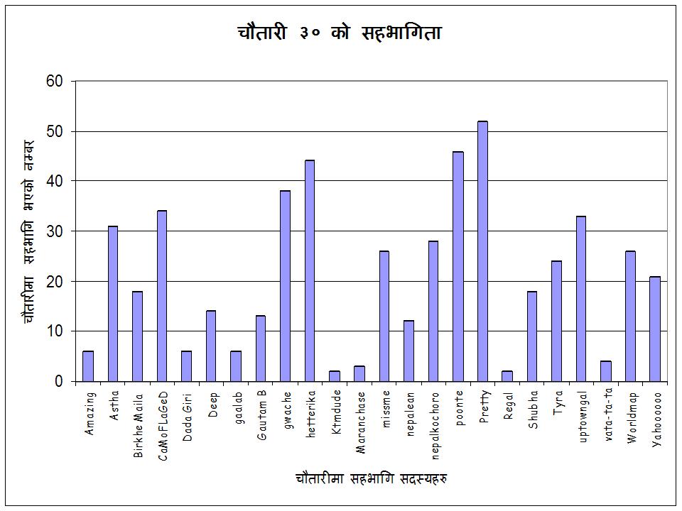 *************************************** मोस्ट कन्ट्रीब्युटर पर्सनालिटी अफ चौतारी *************************************** चौतारी - ३० मा सर्बाधिक (५२ पटक) सहभागिता भएर यो उपाधि प्रीतीको पोल्टामा परेको छ ..... ..............:::::::::::::::::::::::::::::::