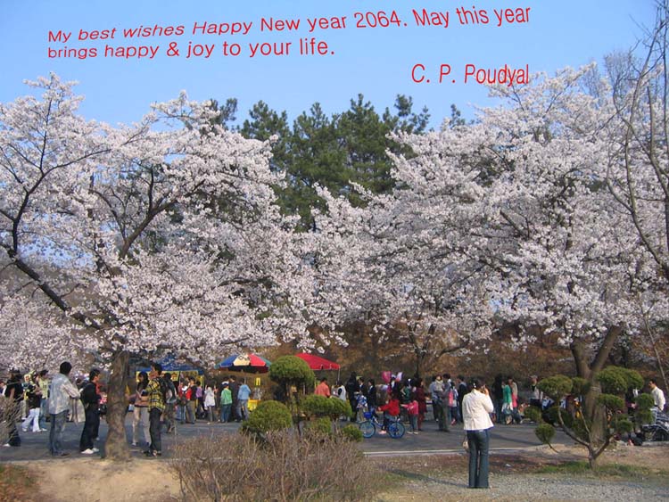 फेरी आयो हर्षको पर्ब, फैलाई हरियाली बसन्त सत्य शान्तिको सन्देश छरी हाँक नव युग अनन्त. नव बर्ष मंगलमय होस् । तपाईं त तपाईं को परिवार को जय जय होस् । २०६४ को शुभकामना