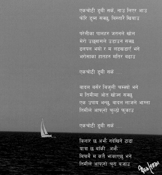 sundachhu--- khai halla hola bhanchhu bujhauchhu bhanchhu man tara--- ti timra patraharu sakshi chhan bhanchhu Warisnama feryou re timle bhanchha man tara-- sundachhu---khai halla hola bhanchhu bujhauchhu bhanchhu man tara---- **** Flicker, just a flicker good enough to confuse defeat with victory the darkness is reining. Can you see?