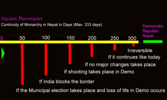 Yes, the countdown for the end of Monarchy, and of course don't forget to still keep on counting down after that for the end of the bahun parties as well. The way it is going and has been, maobadhi is the only way for some fundamental change. Yes, change in this sick system that favors the elite caste called bahuns. The only way to bring peace in Nepal is to break the hegemony of bahuns! Of course I am not saying all bahuns are bad :)