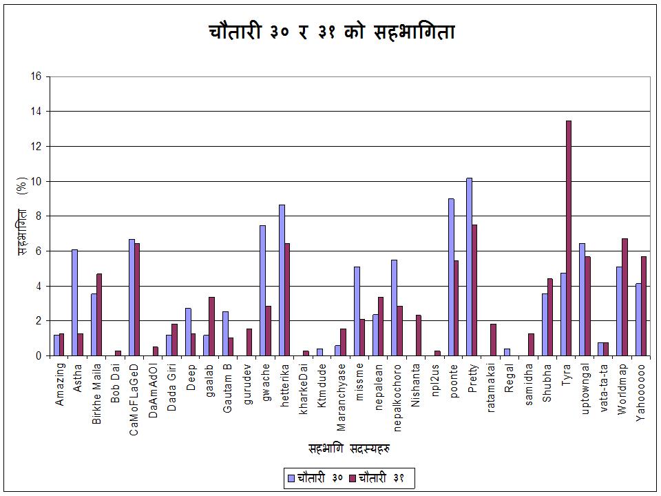 ओहो नयाँ चौतारी पनि बनिसकेछ....... चौतारी बनेको थाहा पाएपछि पुरानो चौतारो को हिसाब किताब गर्न लागेको ठ्याम्मै १ घन्टा लाग्यो भन्या सोझो कुम्ले ले बनाएछ लौ कुम्ले नयाँ चौतारो बनाको मा अरु केहि नभएपनि गोताएले भन्या जस्तो चाँडो बिहे होस् (भाउजुले पढ्ने ता हैन?) र घोर्ले छोरो होस् (छोरा ले पनि पढ्न भयाउला ? )। लौ जा ............... ****************************************************** यस्पाली ता चौतारी मा अचम्मै भो नि सान्नानि कता हो कता हरार ? चौतारी ३० र ३१ को नतिजा सङै हेर्न पाइन्छ यसपाला यसपाली धमकादार सहभागीता तिरुको तर्फ बाट अस्ति खुसु खुसु भन्या जस्तो लाग्थ्यो यामे मेरो पालो कैले आउँछ भनेर लौ तिरु तिम्रै पालो आयो चौतारी ३१ मा.......... यसपाला ४ ओटा नयाँ अनुहार (bob Dai, DaAmAdOl, gurudev, harke Dai, npl2us, ratamakai, samidha) देखियो भने २ ओटा अनुहार (ktmdude, regal) देख्न पाइएन चौतारी ३० मा भन्दा ३१ मा बढि सहभागिता जनाउने हरुमा जिम्बाल बा, दादा गिरी (लेख्दा खेरि पनि तुलसि गिरी को झल्को आम्नि गाँठे), गलब, मरन्च्याँसे, नमे, शुभा, तिरु, चित्रे र म आफै अन्तमा फेरि पनि तिरुलाइ बधाइ छ !!!!!!!!
