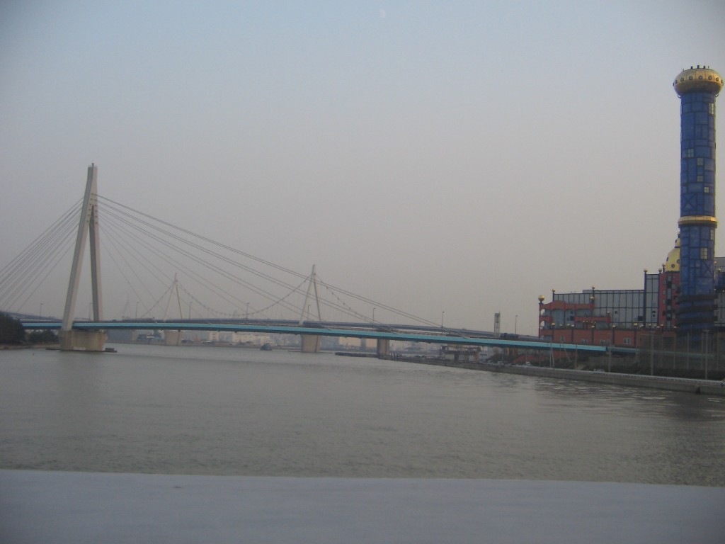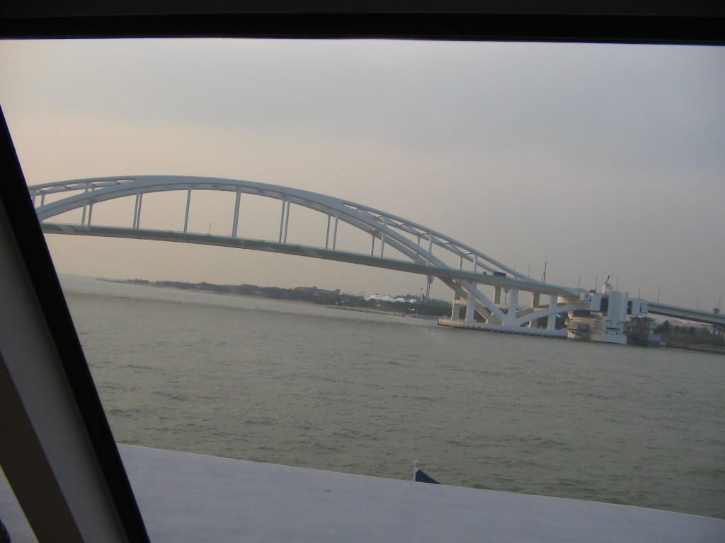यो चईनी पानीमाथि तैरिने पुल। High tide आम्दा यो पुल अलिकति गाडिदो रहेछ आफै, लो Low tide आम्दा फेरि तैरिदो रहेछ, रोडलाईन भनी जहाको तही, ४ मिटर टाईड आम्दा नि केही फरक नपर्नी । हावा हुरी टाईफून आयो भने चईनी पुल त आफ्नो पालो मटर स्टार्ट गरेर बलियो घर भए तिर जाँदो रहेछ, ओत लाग्न ।