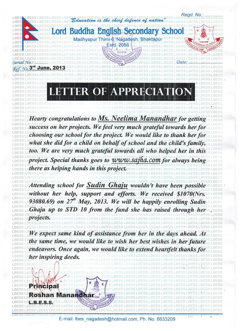 Sajha.com would like to congratulate Neelima on reaching her goal and making a difference in someone's life. Because of her efforts and the generosity of friends and sajha visitors, Sudin Ghaju will be able to get education till 10th grade!