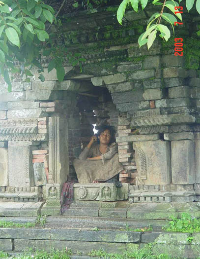 Homeless lunatic taking refuge in a temple, Sankhu.