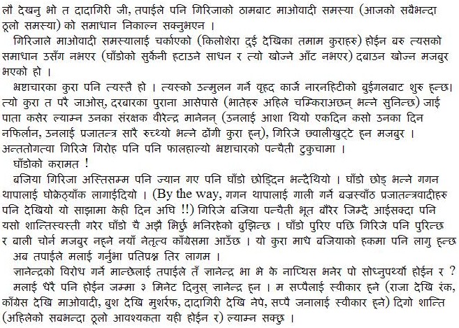 Nepe ji, Gaali nai garne ta maile pani dekheko hu ra maile "gaali ' nai ta nabhanau, kehi maan ko kura chai lekheko hu. But would u mind explaning, why you pointed out on gagan thapa? There were eye witnesses expressing their experience about Mr. thapa. Now how would those persons ( EXCEPT the one with vulgur choice of words) be "bajraswaath"? "Jaisi karani waisi bharani" bhyanne kura sabai lai nabhayepani koi koi lai chai milcha ni, hoina? Ki kaso? Just wanted to hear from you about Mr. Thapa and the reason for your high reagdrs for him. Lu ma chai lage... Jai Nepal, IndisGuise:) P.S: La ta phone ko line khuleklo raicah khusi lagyo. Happy talkin to your loved ones PPL.