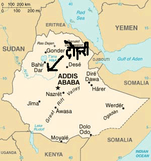 नेपालको छोरा, ईथियोपियाको दुर्गम पहाडि क्षेत्रमा गुप्तवास बसिरा' भौते गुरूले पनि कसरी ईमेल, फोन गर्छन् त? काँ पाउनु त्याँ फोन र ईन्टरनेट? हाम्रा विश्वस्त सूत्रका अनुसार यदि दोहोरीमा हारे भने उनले त्यही पहाडमा कठोर तपस्या गरेर बस्ने प्रण गरेका छन् रे। जिते भने चैं पून्टू मैंयासँगै पुस्पक बिमानमा चढेर ईथियोपियाबाट केनडाँडातर्फ प्रस्थान गर्नेछन्। हेरम् के होला? हाल भौते काजी बसेको दुर्गम पहाडको नक्सा पनि हेरीहालम् न त। स्रोत: http://www.undp.org/bcpr/disred/images/mapas/africa/big/ethiopia.gif