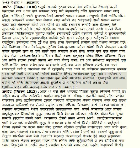 Video available at: - http://www.mysansar.com/?p=321 In Nepali, but video easy to follow for non-Nepali speakers. The demonstrators discuss with the soldiers who are blocking the road, and the army tells them to please understand, they are just doing their duty, and eventually the peaceful demonstrators prevail with no violence from either side.