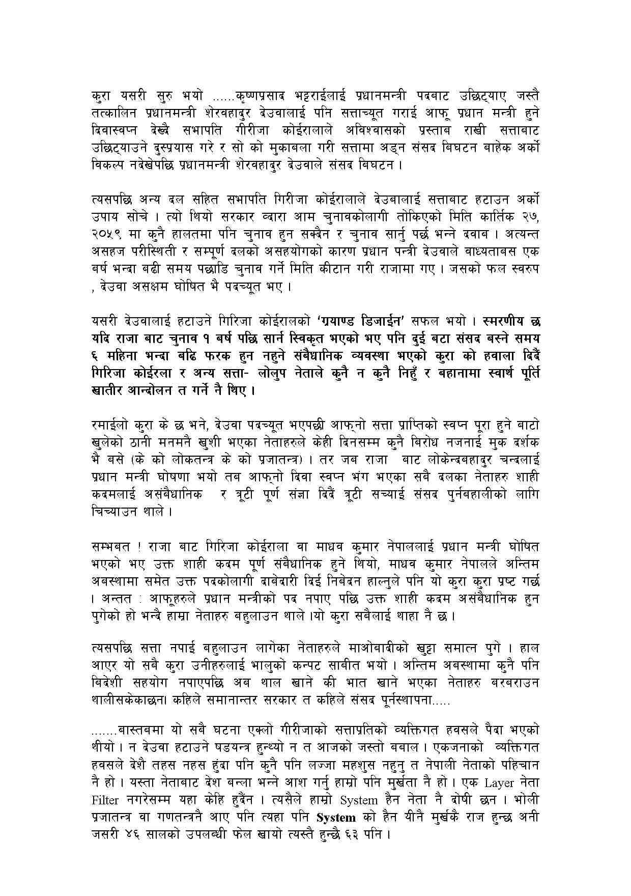 Whatever happens happens for a reason and it is always good. The failure to be united to bring back democracy by going to power then and the same lingering and multipolar opinions now are some faulty moves. But again, maila dai with his "Nehru ignoring" attitude did himself, his ancestors and heirs, no good. As far as the general public is concerned, no body ever had time to spare to think about their welfare.