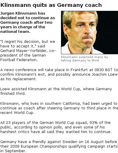 Six reasons why Klinsmann quit Six factors which probably influenced Juergen Klinsmann's decision not to extend his contract with the German football association (DFB) after two years: - Klinsmann was always unpredictable and unconventional during his playing career -- he almost never stayed anywhere for more than two years and left some clubs, like Tottenham Hotspur, after just one season to move on. - He is close to his family and cherishes his anonymous life in California. - The DFB often clashed with Klinsmann during his two years in charge, challenging his decisions, denying several staff requests and hiring some executive personnel he opposed. - Klinsmann faced constant second-guessing and criticism of his California home base and tactics from newspapers. - He knows it will be hard to duplicate the success he has had in taking Germany to the World Cup semi-finals. - Klinsmann does not need the money.