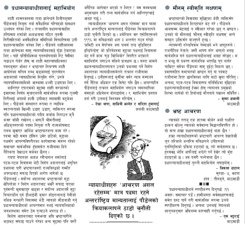 यौन शोषकको तुजुक १३ वर्षकी छोरीलाई पाशविक बलात्कार गर्दै ३०-३० वर्ष सम्म आफ्नो यौन क्षुधा मेटाउने पशु आज नेपालमा १ नँबरको न्यायाधीश बनेका छन भन्ने सुन्नु पर्दा बढो दु:ख लाग्छ। आफ्ना काला करतुत सार्वजनिक होला भन्ने डरले "लागु पदार्थको कारोबार" जस्तो जीवनभर जेलमा सडाउने अभियोगमा छोरीलाई जेलमा कोच्ने र पत्रकारहरुका साँईसुँई पछि रातारात जेलबाट गायब गर्न समर्थ नेपालका १ नँबरी न्यायाधीश आज आफ्नो "चरित्र हत्या" भयो भन्दै कर्मठ पत्रकारहरुका बयान लिन लागेका रहेछन। http://lokatantra.blogspot.com/2007/06/blog-post_26.html ढाकछोपबन्द गर! नेपालका वर्तमान प्रधान न्यायाधीश दिलिप कुमार पौडेलका आर्थिक आचरणका बारेमा उठेका प्रश्नहरु सेलाउन नपाउँदै अर्को नयाँ सनसनीखेज धमाका हुन गएको छ। आफ्नै धर्मपुत्रीसँग ३०औँ वर्षदेखि अनैतिक यौनसँबन्ध राखेको र यो शुरुआत १३ वर्षकी बालिका हुँदा देखि गरेको भन्ने आरोपले हाडनाता करणीसँबन्धि के कस्ता महलहरु आकर्षित गर्लान त्यो आफ्नै ठाँउमा छ। तर, आर्थिक भ्रष्टाचारको मु्द्दा सेलाउन नपाउँदै आएको यौन दुराचार र शोषणको कुराले प्रधानन्यायाधीश आफैको मात्र होईन नेपालको सँपूर्ण न्यायिक क्षेत्रमाथि नै जनविश्वास हटने देखिएको छ । http://lokatantra.blogspot.com/2007/06/blog-post_19.html