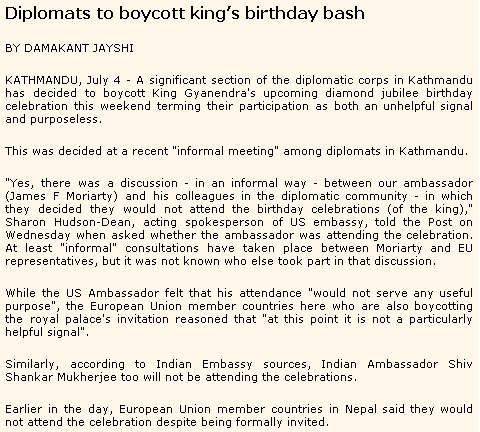 . EU envoys to boycott King’s birthday reception Kantipur Report KATHMANDU, July 4 - Ambassadors to Nepal of the member states of the European Union (EU) on Wednesday decided not to attend the tea reception being organised by the Royal Palace on July 8 to mark King Gyanendra's 61st birthday. British Ambassador to Nepal, Andrew Hall -- who assumed the local EU Presidency from Sunday -- announced the decision today during a press meet in the capital. Hall said that the EU envoys had refused the Royal Palace invitation because accepting it in the present circumstances would not cast a positive impression. “We, representatives of the European Union, have decided that we will not be able to attend the party,” said the British envoy. He also clarified that the Foreign Ministry had not sent any verbal or written request to do so. Ambassador Hall also urged the government and the political parties to work towards creating a favourable environment for the Constituent Assembly election to be held on November 22. He said that the government needs to empower the police forces to maintain law and order in the country to hold free and fair elections. Among the 27 member states of the EU- five countries, Germany, France, Finland, Denmark and England have embassies in the country. Earlier, American and Indian envoys James F. Moriarty and Shiv Shankar Mukherjee respectively had made it clear that they would not be attending the party. .