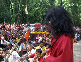 बाराको हलखोरी जंगलस्थित तपस्यास्थलमा बिहीबार माइकबाट प्रवचन दिँदै तपस्वी रामबहादुर बमजन । उनले बिहान ११ बजेदेखि तीन घन्टा जंगलबीच बनाइएको मञ्चबाट प्रवचन दिए । त्यस क्रममा उनले मुलुकलाई बचाउने एक मात्र उपाय धर्म भएको बताए । अड्की-अड्की बोलेका उनले आफूलाई शंका नगर्न र बाधा नपुर्‍याउन आग्रहसमेत गरे । नमोबुद्ध तपोवन समितिले स्थानीय एफएममा गरेको प्रचार र टेलिफोनबाट दिएको सूचना आधारमा प्रवचनमा करिब ३ हजार सर्वसाधारण जम्मा भएका थिए । २०६२ जेठ २ देखि बाराकै रतनपुरी जंगलमा तपस्यारत भेटिएका बमजन ँदर्शनार्थीको भीडले अशान्ति’ भएको भन्दै नौ महिनामा बेपत्ता भएका थिए । २०६३ चैत १० मा करिब आठ किमिपश्चिम बाघझोर जंगलमा तरबारसहित फेला परेका उनी भोलिपल्टदेखि हलखोरीमा सिमेन्टको बंकरभित्र तपस्यामा बसेका थिए ।