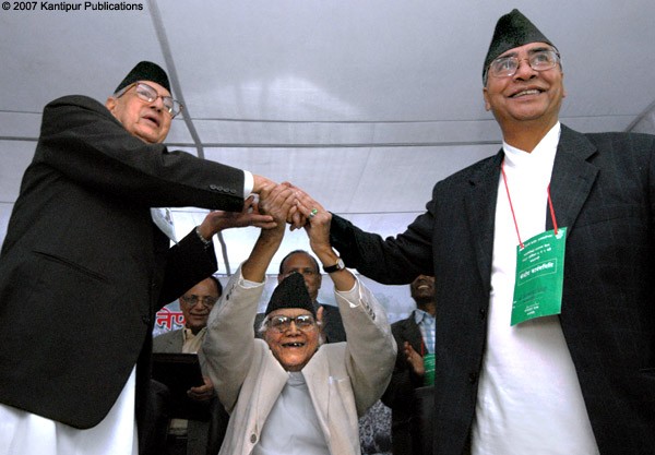 look at all their faces.....the same old criminals clinging to power.....these are the same criminals who have destroyed our country and had given birth to the commie mao bastards ............in the name of dirty politics they formed an alliance with their arch rival maos to fight the king and now they part ways.........now congress unification......you know why they feel threatened ......not only by the maoists but also by the king......so they unite for the sense of security in numbers...not to bring peace and stability to the country........Will the maos let them bring peace????? or the situation in the terai let them bask in the sun with ease....??????? how long can these political criminals of Nepal go unpunished.........they must feel SOOOO invinceble after ousting the king and still seeeing the people supporting them .....man they must laugh at the Nepalese people for being sooo dumb......they keep on falling for the same false hope..........THE defination of insanity.....doing the samething over and over again and expecting change.............We see these curropt government who can lead the nation to the darkest times to the brightest times just fight for power and that also at the cost of thousands of precious nepalese lives...............I pray that they all Rott in Hell.....I hope SOMEONE do something about these political thugs and the murdering Maoists..who are now responsible for all the restless PLA who were offered so much to join their cause.....Prachandas wish to become a Dictator like the North Korean Assho*le