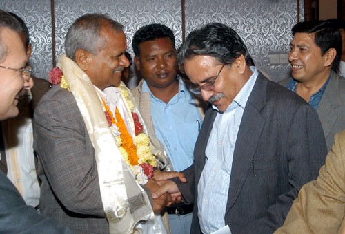 Dr Yadav in this picture must be showing his gratitude to Maoists for not supporting Makune or Girija to the post of president by Maoists so that he could become the first president of Nepal.
