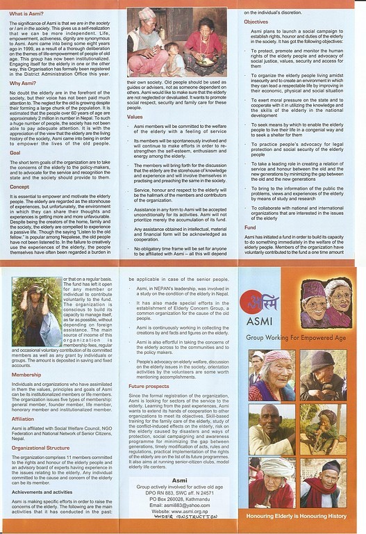 Asmi is an organization working to ease the livelihoods and dignified life of senior citizen of Nepal. Though Asmi was informally active since 1999 but now it is registered in District Administration Office (CDO) Kathmandu in Feb 2008. Socio economic situation is changing sharply. Traditional social values are detoriated regarding the senior citizen. Youths are migrated either abroad or urban area to tap the economic opportunities. That resulted the senior citizens are compelled to stay back in the village and serve their grand children and their properties.