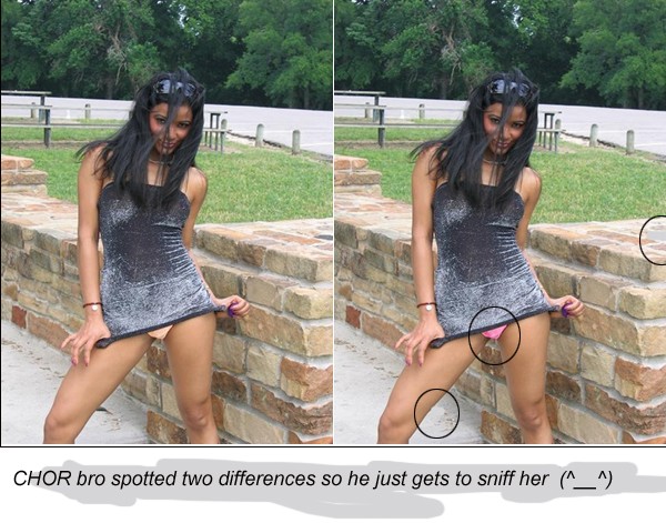 You didn't say how many brotha??? I can spot one.. her panties are different color.. below her right thigh from her side.. the gravel is missing.. can't think of none.. you didn't say how many.. that is all I can see at this time.. LOL