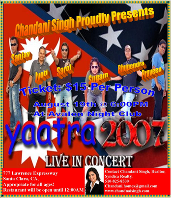Lets rock ....with the beats & melodies of Sugam Pokhrel, Saroj Dutta, Jyoti Ghimire, Bhupendra Bharcharya, Praveen Manandhar & one of the most talented singer...........is no one.......but SANJAY SHRESTHA........... LIVE IN CONCERT IN BAY AREA CA! LETS NOT MISS OUT THIS GREAT EVENING OF MUSIC AND DANCE...................Mark YOUR CALENDAR NOW!!!!! FOR THE DANCE LOVER: COME AND READY TO PARTY WITH BAY AREA'S #1 DJ, DJVIK!! AFTER THE CONCERT!!!!!!!!!!!! See you all at the Night Club Avalon!!!!! Tickets available at the gate & online at www.chandanisingh.com!! Ticets: $15 per person! Show Time: 6:00 PM!! Event for All Ages! FOR INFO CONTACT: CHANDANI SINGH @ 510-825-8500 0R EMAIL:chandani.homes@gmail.com or visit: