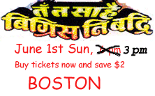 **************************** TA TA SARAI BIGRIS NI BADRI *************************** Date: June 1,2003 Sunday 3 pm Bombay Cinema2, 214 Harvard Avenue, Allston, MA Tickets: Advance: $ 8 Door: $10 Hall Capacity: 190 Parking: Free parking behind the theater Advance tickets for "TA TA SARAI BIGRIS NI BADRI" will be available online at www.gbnc.org until May 31st midnight(EST). Director: Daya Ram Dahal Producer: Hari Bansha Acharya, Kiran K. C. and Manoj Rathi Music: Sambhujit Baskota Artists: Hari Bansha Acharya, Susmita K.C., Bhuwan K. C. and Bipana Thapa "TA TA SARAI BIGRIS NI BADRI" is a film full of wit and humor. It depicts the changing lifestyle of the youths living in the periphery of Kathmandu. "TA TA SARAI BIGRIS NI BADRI" was a "super hit" movie in Nepal in 2001. Susmita K. C. won the best actress award for her role in the film. It was screened for more than 100 days in one of the theaters in Kathmandu.
