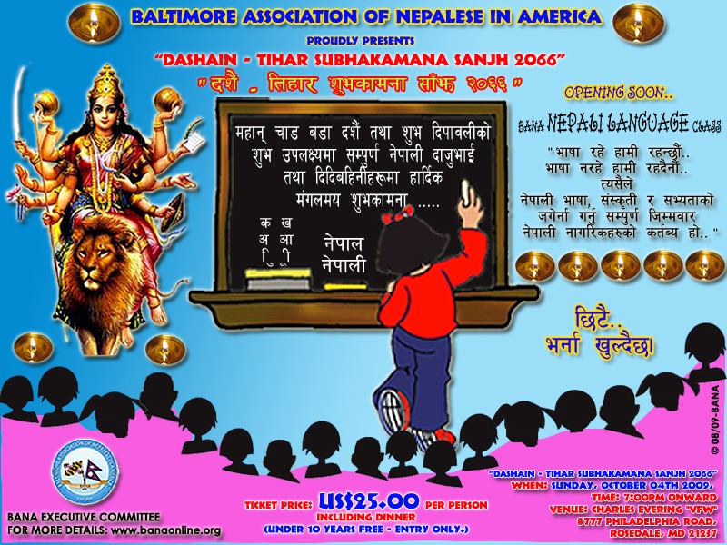 BANA invites you to Annual "Dashain & Tihar Subhakamana Saanjh - 2066". This Program will benefit Nepali Language School. All the proceeds form this event will go to this project for its effort to establish a Nepali Language School/Class in Baltimore. We think that it is a wonderful way to utilize the proceeds from the program to benefit our children. We would like you to be a part of this great beginning (Nepali School). Please join us in this magnificent celebration for a great cause!!