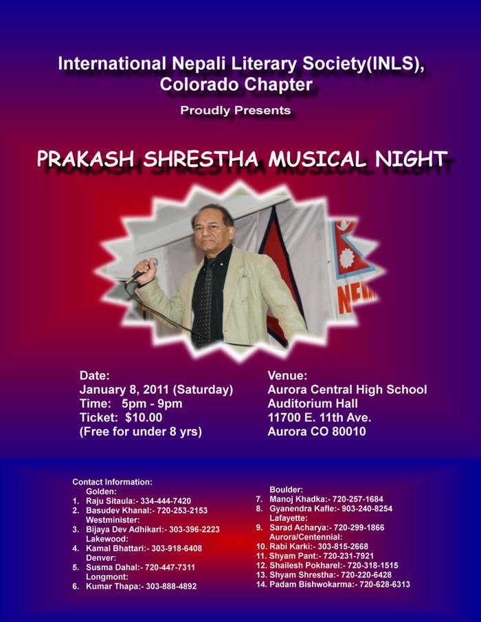 International Nepali Literary Society (INLS), Colorado Chapter is organizing 'Prakash Shrestha Musical Night' in Denver, Colorado. Singer Shrestha, one of the leading modern singer of the Nepalese Music Industry, will be presenting magic of his singing through some of his all time favorite songs. So don't miss to be a part of the muscial and magical moment.