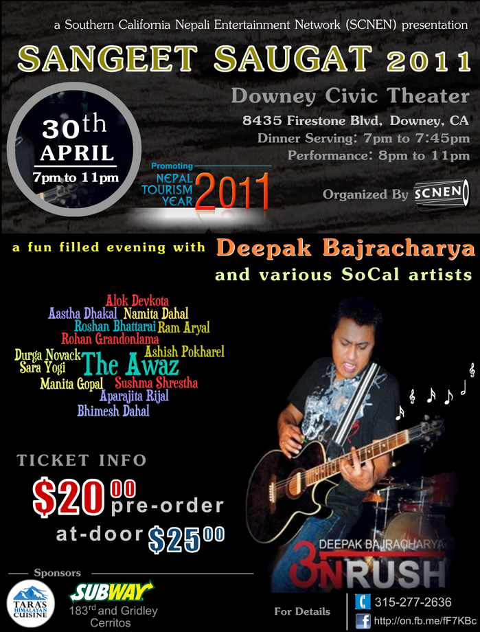 Southern California Nepali Entertainment Network (SCNEN) is organizing Sangeet Saugat 2011, a musical evening with Deepak Bajracharya and various So Cal artists.