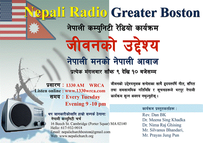 We are glad to inform you that Nepali Community Church, Cambridge has initiated to bring out Nepali community radio program for the first time in New England (purely not-for profit making) from 6th Dec 2011. Our program will be aired from 9pm to 10 pm every Tuesday from 1330am WRCA frequency. It also can be listened live online at http://www.1330wrca.com. To make this initiative known to all of Nepalese brothers and sisters in Greater Boston and beyond, we request you to please share this news with your friends.