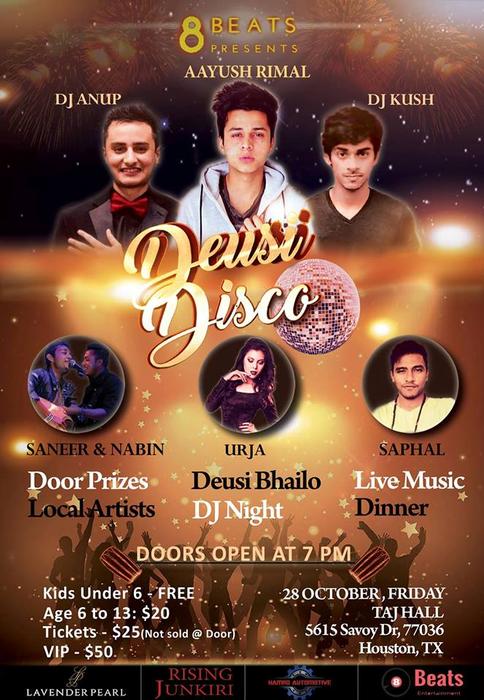 will be hosting DEUSI DISCO Houston alongside UrJa Kc. Big shoutout to all our supporters for making this event happen! Lavender Pearl Rising Junkiri Hamro Automotive Come see emerging local artists in action, enjoy DEUSI-BHAILO and get ready to DISCO!