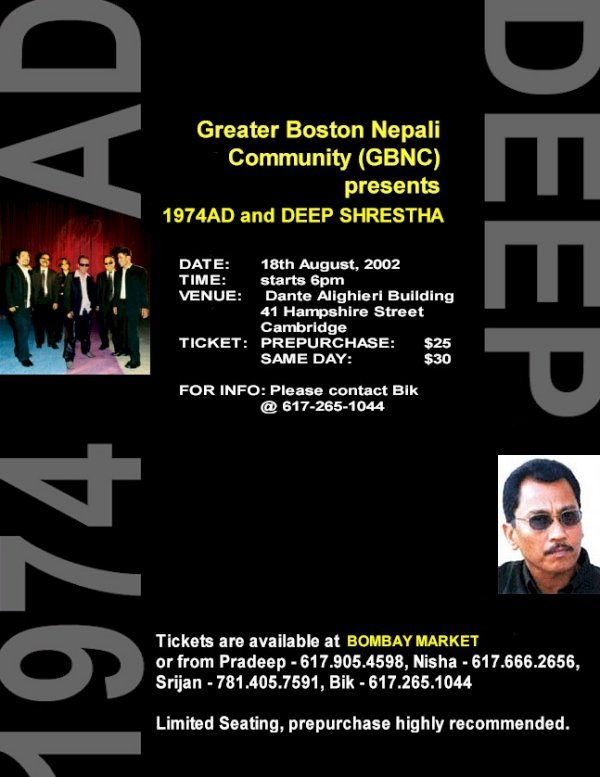Ladies and Gentlemen, GBNC is proud to bring you a concert from 1974AD and Deep Shrestha to Boston. This is a dream come true for many Nepali music lovers. The duo is on a tour across the US that started in Washington DC during the ANA Convention. They have been receiving rave reviews everywhere. From Hong Kong, Washington DC to San Francisco. Do not miss this opportunity to catch 1974AD: an upcoming and wildly popular, new phenomenon and a Nepali classic: Deep Shrestha. Broguht right here at your doorstep. The details of the concert are: Date: 18th of August, 2002 TIME: 6pm LOCATION: Dante Alighieri Society 41 Hampshire St, Cambridge, MA 02139 TICKET: $25 advance purchase $30 at gate Please contact Pradeep (617-905 4598) to purchase tickets in advance and save money. (Soft drinks will be provided as refreshments.) Please remember seats are limited. Dante Alighieri is a small hall with an intimate setting. So, while the show will be hot, seats will be limited. Make sure to purchase tickets in advance and avoid being left out. Please contact Bik at 617-265-1044 or at president@gbnc.org with any inquiries. NOTE: Children under 10, not admitted to the concert. *****************************************