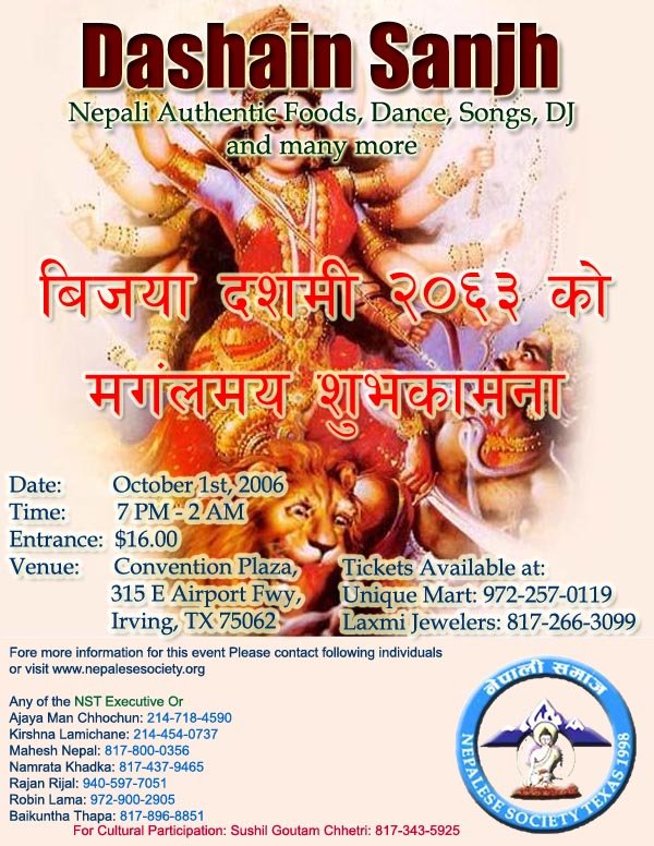 Nepalese Society Texas is hosting Dashain Celebration on October 1st, 2006. We would like to request all the DFW Nepalese Community to attend this event. Cultural Program, Dance, Dinner, DJ. For more details please visit www.nepalesesociety.org Nepalese society Texas