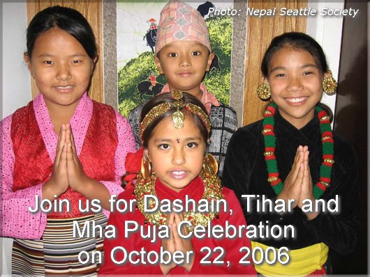 Nepal Seattle Society (NSS) proudly announces the Annual Dashain, Tihar and Mha Puja Celebration on Sunday, October 22, 2006 at Egan Hall in Greenwood. Please join us to celebrate our diverse Nepali culture. Let's meet and greet each other, enjoy the food of Nepal and socialize together during this festival season. In conjunction with our Dashain Celebration we will be donating 50% of the Entrance Fee to NSS Disaster Relief Fund to help support the recent floods and landslide victims in Nepal.